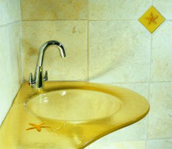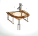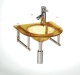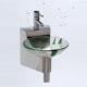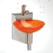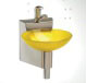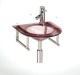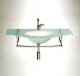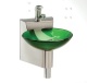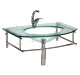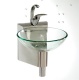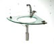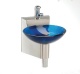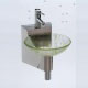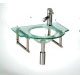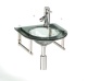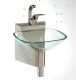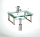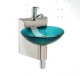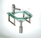מבחר כיורי זכוכית בעיצובים וצבעים שונים, עם מעמד עשוי נירוסטה וסיפון מניקל.