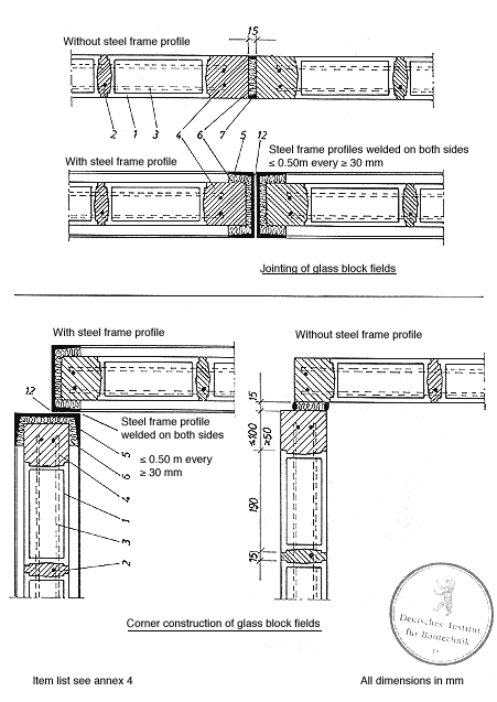 components. At their upper edge the glass block fields shall be fixed at a spacing